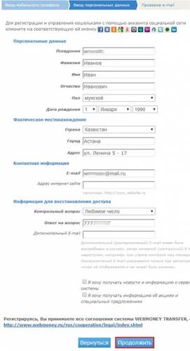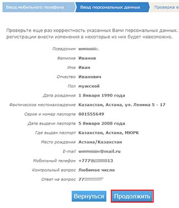 5. После этого может появиться сообщение с ошибкой, что Вы не заполнили все данные и появится поле «Паспортные данные». Здесь мы тоже заполняем всё по-честному, т.е. берём именно свой паспорт и оттуда списываем всё необходимое. Это нам пригодится для создания аттестата на вебмани, а аттестат пожалуй там очень важен для нас. Также данные нужны, если мы захотим пополнить счёт вебмани в каком-то банке или в любом отделе. И снова мы нажимаем «Продолжить».
