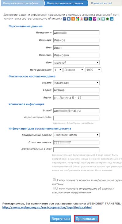 4. Сейчас перед Нами открывается страница для заполнения наших данных. Пишите здесь только правду. Не надо придумывать чужие имена и фамилии, адреса и дату рождения. Вот Вам пример заполнения анкеты. После заполнения всех данных мы снова нажимаем на кнопочку «Продолжить».