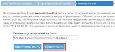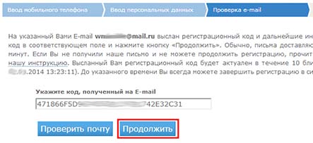 7. После этого мы проверяем нашу почту и смотрим не пришло ли нам письмо с кодом подтверждения . Письмо должно прийти в течении 5 минут. Открываем полученное письмо и ищем присланный код. Код будет похож на что-то вроде этого: A15872C504S244BBEDAEFADEF3A265D51C6 МЫ копируем данный код и возвращаемся на сайт. В соответствующее поле мы вставляем данный код и нажимаем на кнопочку «Продолжить».