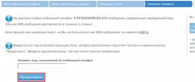 8. Следующий этап, это подтверждение нашего телефона. На наш номер должна прийти СМС-ка с кодом. Код обычно небольшой, примерно 5-6 цифр. Эту СМС-ку нужно ввести в соответствующее поле и снова нажимаем «Продолжить».