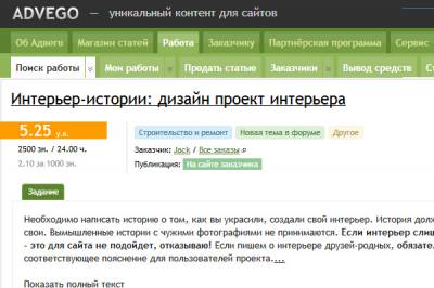 Здравствуйте! Сегодня я хотел бы Вам рассказать о моём самом любимом виде заработка, это «написание статей» . Это такой вид заработка, где любой человек, будь он ученик, студент, рабочий или кто-нибудь ещё, сможет зарабатывать деньги сидя дома или ещё где-нибудь за компьютером. Главное в этой профессии, это конечно же знание русского языка. Без него у Вас просто нет шансов на хороший заработок в написании статей, ведь собственно говоря, никому они не будут интересны и многие вообще будут держаться за голову при чтении таких статей. Также, если Вы хорошо писали сочинения или же изложения, то это Вам будет только плюсом, т.к это значит, что Вы всё же умеете хорошо писать. Если Вы ещё хорошо мыслите, печатаете быстро, то у Вас появляется всё больше шансов, чтобы начать хорошо зарабатывать. Итак, существует 2 вида написания статей: 1. Копирайтинг – это написание вашей собственной статьи буквально с нуля. В этой статье Вы пишете о том, что Вам очень близко, о чём Вы сможете всё ярко, красиво и толково расписать. 2. Рерайтинг – это можно сказать, изложение какой-либо статьи своими словами. Вы можете прочитать статью или несколько статей и ориентируясь по ним написать статью. Люди очень часто бросают это работу, как и многие другие в самом начале работы, потому что они не верят в себя, думают, что им просто нереально написать какую-либо статью. Я Вам могу только посоветовать поверить в себя и скажу так, что каждый может писать такие статьи. Один чуть лучше, другой чуть хуже, но через некоторое время Вы адаптируетесь к данной работе и Вы будете просто на всего щёлкать эти статьи. С чего же мы для начала начнём? А начнём с регистрации на биржах статей. Я Вам предлагаю зарегистрироваться на 2 самых лучших таких биржах. Это Advego и TextSale После регистрации, Вы можете приступать к работе. Выбирайте темы более знакомые Вам, в которых Вы будете хорошо разбираться. Вы можете выбрать какую-либо из предложенных тем или написать статью на собственную тему и потом её продавать. Чем больше будет уникальность Ваших слов, тем больше будет желающих купить Вашу статью. Ведь в основном такие статьи заказывают свои вебмастера, для раскрутки своих сайтов, т.к. поисковые машины быстрее находят сайты с уникальным текстом. Статьи сейчас очень ценятся и поэтому за них неплохо таки платят. Статья в среднем стоит от 1$ до 15$ в зависимости от темы и количества символов в статье. Если у Вас возникнут проблемы, Вам нужна будет помощь по каким-либо вопросам, то обращайтесь к нам, написав в нашей гостевой книге или же по скайпу: igor0034